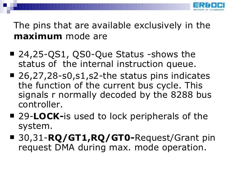67. 70. The pins that are available exclusively in the maximum mode are <ul><li>24,25-QS1, QS0-Que Status -shows the status of the internal instruction queue. </li></ul><ul><li>26,27,28-s0,s1,s2-the status pins indicates the function of the current bus cycle. This signals r normally decoded by the 8288 bus controller. </li></ul><ul><li>29- LOCK- is used to lock peripherals of the system. </li></ul><ul><li>30,31- RQ/GT1,RQ/GT0- Request/Grant pin request DMA during max. mode operation. </li></ul>