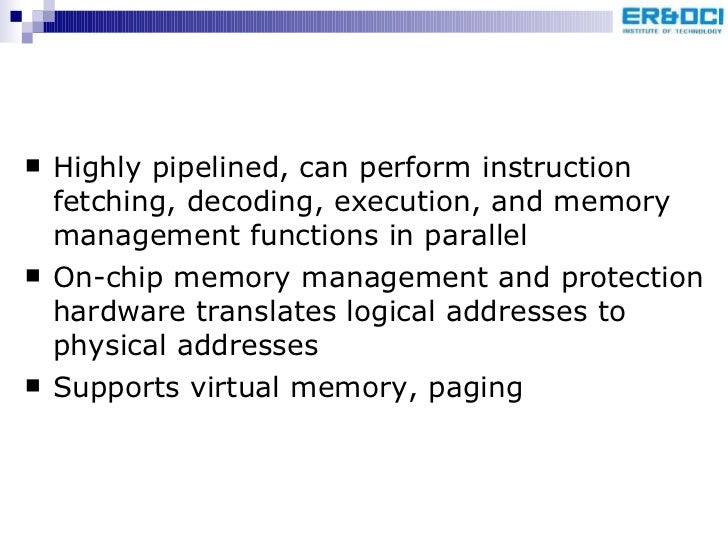 69. 72. <ul><li>Highly pipelined, can perform instruction fetching, decoding, execution, and memory management functions in parallel </li></ul><ul><li>On-chip memory management and protection hardware translates logical addresses to physical addresses </li></ul><ul><li>Supports virtual memory, paging </li></ul>