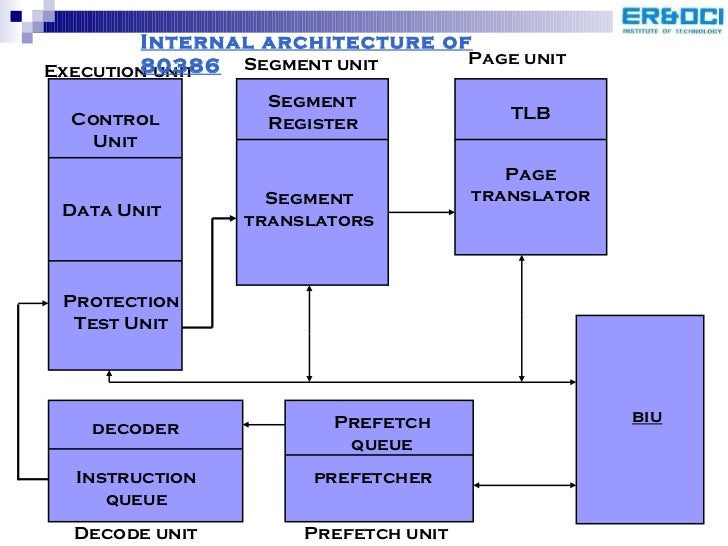 70. 73. Control Unit Data Unit Protection Test Unit Segment Register Segment translators TLB Page translator decoder Instruction queue Prefetch queue prefetcher biu Decode unit Prefetch unit Page unit Execution unit Segment unit Internal architecture of 80386