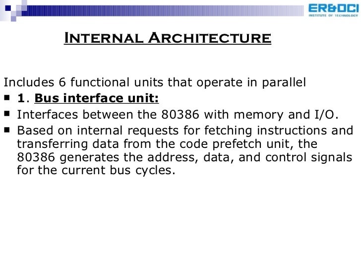 71. 74. Internal Architecture <ul><li>Includes 6 functional units that operate in parallel </li></ul><ul><li>1 . Bus interface unit: </li></ul><ul><li>Interfaces between the 80386 with memory and I/O. </li></ul><ul><li>Based on internal requests for fetching instructions and transferring data from the code prefetch unit, the 80386 generates the address, data, and control signals for the current bus cycles. </li></ul>