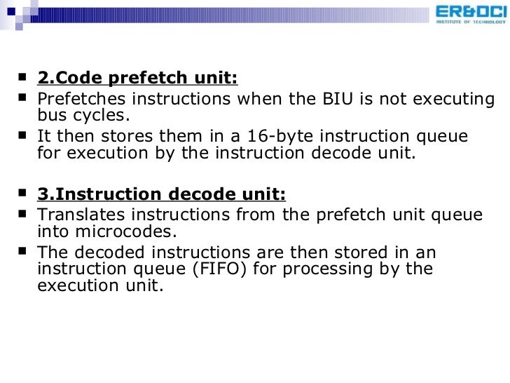 72. 75. <ul><li>2.Code prefetch unit: </li></ul><ul><li>Prefetches instructions when the BIU is not executing bus cycles. </li></ul><ul><li>It then stores them in a 16-byte instruction queue for execution by the instruction decode unit. </li></ul><ul><li>3.Instruction decode unit: </li></ul><ul><li>Translates instructions from the prefetch unit queue into microcodes. </li></ul><ul><li>The decoded instructions are then stored in an instruction queue (FIFO) for processing by the execution unit. </li></ul>