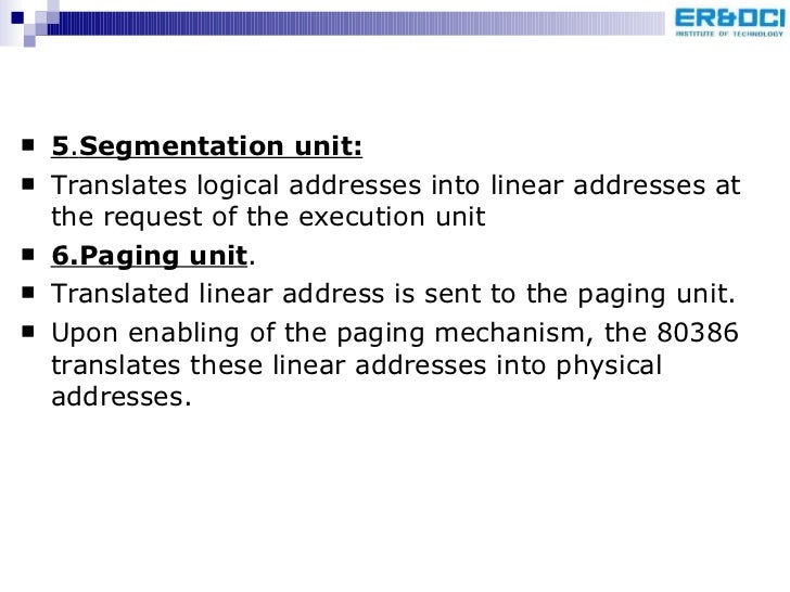 74. 77. <ul><li>5 . Segmentation unit: </li></ul><ul><li>Translates logical addresses into linear addresses at the request of the execution unit </li></ul><ul><li>6.Paging unit . </li></ul><ul><li>Translated linear address is sent to the paging unit. </li></ul><ul><li>Upon enabling of the paging mechanism, the 80386 translates these linear addresses into physical addresses. </li></ul>