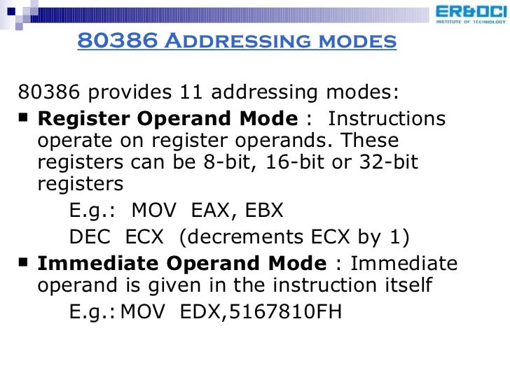 81. 84. 80386 Addressing modes <ul><li>80386 provides 11 addressing modes: </li></ul><ul><li>Register Operand Mode : Instructions operate on register operands. These registers can be 8-bit, 16-bit or 32-bit registers </li></ul><ul><li>E.g.: MOV EAX, EBX </li></ul><ul><li>DEC ECX (decrements ECX by 1) </li></ul><ul><li>Immediate Operand Mode : Immediate operand is given in the instruction itself </li></ul><ul><li>E.g.: MOV EDX,5167810FH </li></ul>