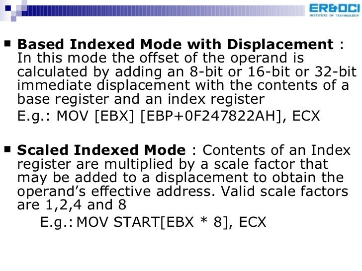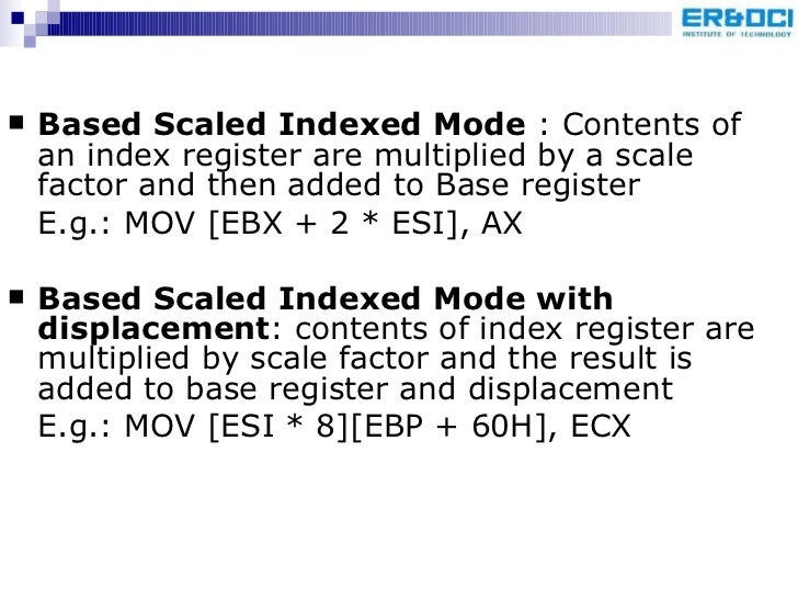 85. 88. <ul><li>Based Scaled Indexed Mode : Contents of an index register are multiplied by a scale factor and then added to Base register </li></ul><ul><li>E.g.: MOV [EBX + 2 * ESI], AX </li></ul><ul><li>Based Scaled Indexed Mode with displacement : contents of index register are multiplied by scale factor and the result is added to base register and displacement </li></ul><ul><li>E.g.: MOV [ESI * 8][EBP + 60H], ECX </li></ul>