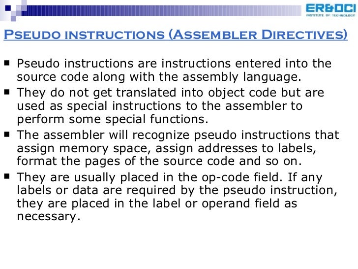 86. 89. Pseudo instructions (Assembler Directives) <ul><li>Pseudo instructions are instructions entered into the source code along with the assembly language. </li></ul><ul><li>They do not get translated into object code but are used as special instructions to the assembler to perform some special functions. </li></ul><ul><li>The assembler will recognize pseudo instructions that assign memory space, assign addresses to labels, format the pages of the source code and so on. </li></ul><ul><li>They are usually placed in the op-code field. If any labels or data are required by the pseudo instruction, they are placed in the label or operand field as necessary. </li></ul>