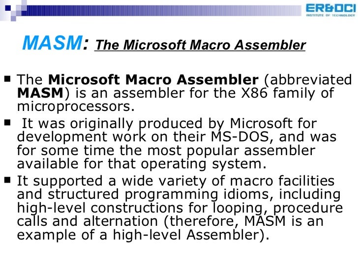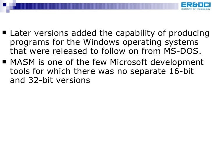 91. 94. <ul><li>Later versions added the capability of producing programs for the Windows operating systems that were released to follow on from MS-DOS. </li></ul><ul><li>MASM is one of the few Microsoft development tools for which there was no separate 16-bit and 32-bit versions </li></ul>