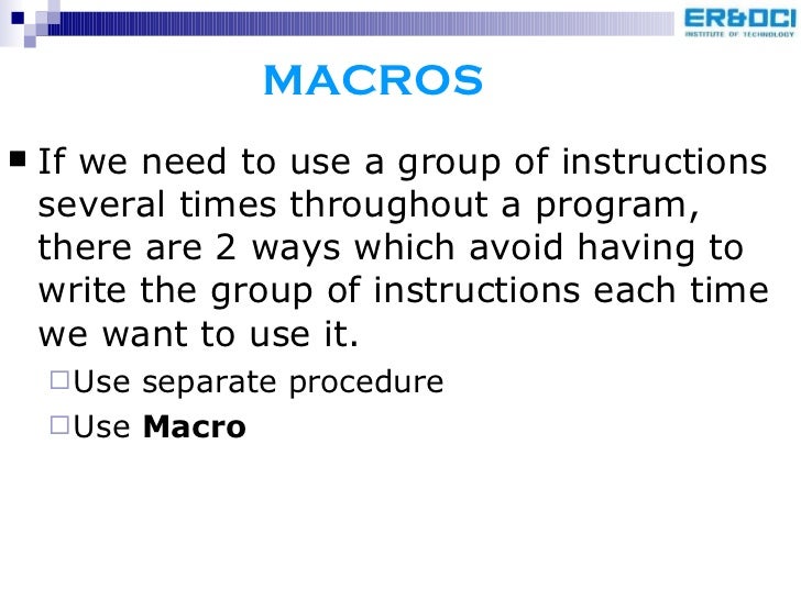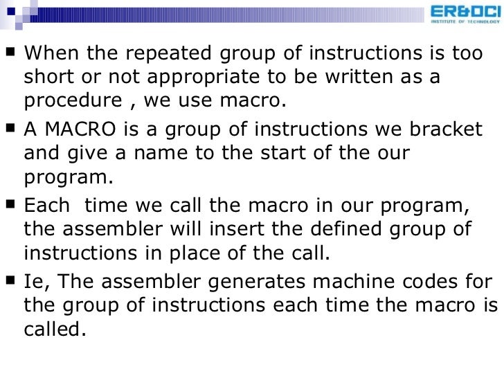 93. 96. <ul><li>When the repeated group of instructions is too short or not appropriate to be written as a procedure , we use macro. </li></ul><ul><li>A MACRO is a group of instructions we bracket and give a name to the start of the our program. </li></ul><ul><li>Each time we call the macro in our program, the assembler will insert the defined group of instructions in place of the call. </li></ul><ul><li>Ie, The assembler generates machine codes for the group of instructions each time the macro is called. </li></ul>
