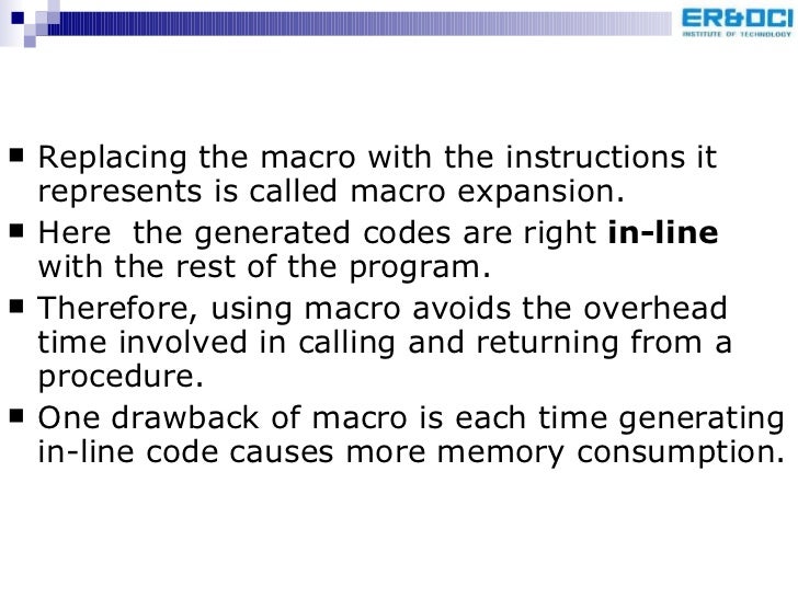 94. 97. <ul><li>Replacing the macro with the instructions it represents is called macro expansion. </li></ul><ul><li>Here the generated codes are right in-line with the rest of the program. </li></ul><ul><li>Therefore, using macro avoids the overhead time involved in calling and returning from a procedure. </li></ul><ul><li>One drawback of macro is each time generating in-line code causes more memory consumption. </li></ul>