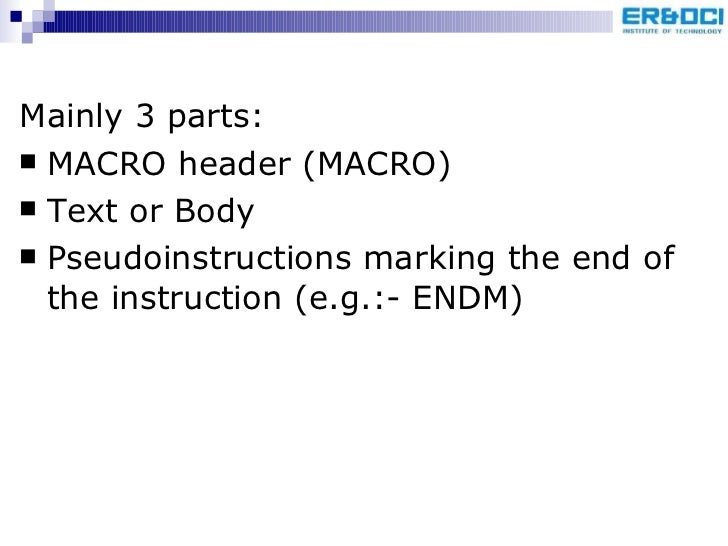 95. 98. <ul><li>Mainly 3 parts: </li></ul><ul><li>MACRO header (MACRO) </li></ul><ul><li>Text or Body </li></ul><ul><li>Pseudoinstructions marking the end of the instruction (e.g.:- ENDM) </li></ul>