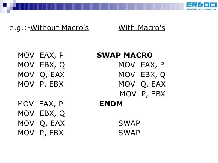 96. 99. <ul><li>e.g.:- Without Macro’s With Macro’s </li></ul><ul><li>MOV EAX, P SWAP MACRO </li></ul><ul><li>MOV EBX, Q MOV EAX, P </li></ul><ul><li>MOV Q, EAX MOV EBX, Q </li></ul><ul><li>MOV P, EBX MOV Q, EAX </li></ul><ul><li> MOV P, EBX </li></ul><ul><li>MOV EAX, P ENDM </li></ul><ul><li>MOV EBX, Q </li></ul><ul><li>MOV Q, EAX SWAP </li></ul><ul><li>MOV P, EBX SWAP </li></ul>