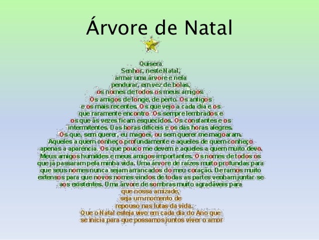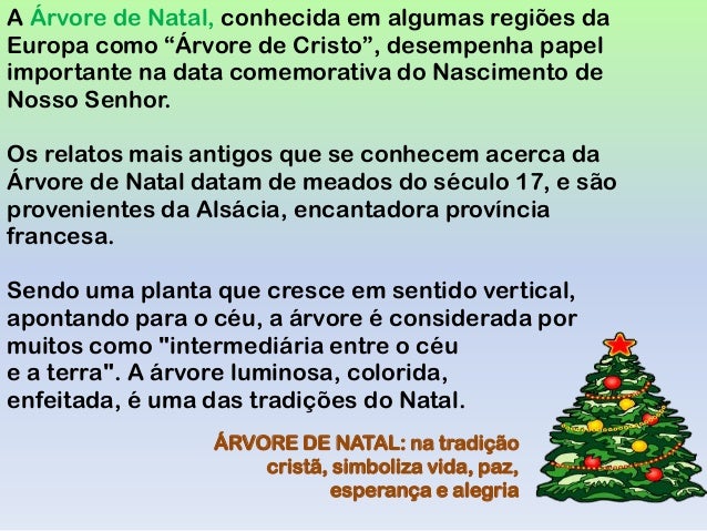 11. 11. A Árvore de Natal, conhecida em algumas regiões daEuropa como “Árvore de Cristo”, desempenha papelimportante na data comemorativa do Nascimento deNosso Senhor.Os relatos mais antigos que se conhecem acerca daÁrvore de Natal datam de meados do século 17, e sãoprovenientes da Alsácia, encantadora provínciafrancesa.Sendo uma planta que cresce em sentido vertical,apontando para o céu, a árvore é considerada pormuitos como "intermediária entre o céue a terra". A árvore luminosa, colorida,enfeitada, é uma das tradições do Natal. ÁRVORE DE NATAL: na tradição cristã, simboliza vida, paz, esperança e alegria