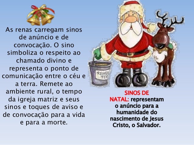 15. 15. As renas carregam sinos de anúncio e de convocação. O sino simboliza o respeito ao chamado divino e representa o ponto decomunicação entre o céu e a terra. Remete ao ambiente rural, o tempo SINOS DE da igreja matriz e seus NATAL: representam sinos e toques de aviso e o anúncio para a humanidade dode convocação para a vida nascimento de Jesus e para a morte. Cristo, o Salvador.