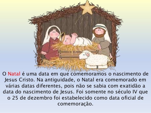 1. 1. O Natal é uma data em que comemoramos o nascimento de Jesus Cristo. Na antiguidade, o Natal era comemorado em várias datas diferentes, pois não se sabia com exatidão adata do nascimento de Jesus. Foi somente no século IV que o 25 de dezembro foi estabelecido como data oficial de comemoração.
