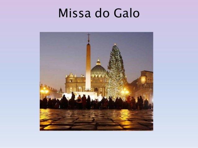 20. 20. • Missa do Galo é o nome dado em países católicos à missa celebrada depois do jantar da Véspera de Natal que começa à meia noite de 24 para 25 de Dezembro.• Seu nome consagra a lenda segundo a qual à meia-noite do dia 24 de dezembro um galo teria cantado, anunciando a vinda do Messias. Outra origem da expressão é citada em o De onde vem as palavras, de Deonísio da Silva (Editora A Girafa): como o fato de aMissa de Natal normalmente terminar muito tarde "quando as pessoas voltavam para casa, os galos já estavam cantando".• Na Missa do Galo já todas as velas do Advento se encontram acesas e canta-se o cântico de Glória. Dada a sua importância, o próprio papa faz questão de rezá-la.• Tradicionalmente, depois da missa, as famílias voltam para casa, colocam a imagem do Menino Jesus no Presépio, distribuem os presentes e compartilham a Ceia de Natal.