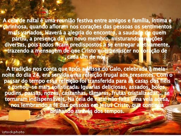 22. 22. A ceia de natal é uma reunião festiva entre amigos e família, íntima ecarinhosa, quando afloram nos corações das pessoas os sentimentos mais variados. Haverá a alegria do encontro, a saudade de quem partiu, a presença de um novo membro, misturando emoções diversas, pois todos ficam predispostos a se entregar afetivamente, trazendo a mensagem de que Cristo quer renascer no coração de cada um de nós. A tradição nos conta que após a Missa do Galo, celebrada à meia-noite do dia 24, era servida uma refeição frugal aos presentes. Com o passar do tempo essa refeição foi transferida para as casas dos fiéis e tornou-se mais sofisticada. Iguarias deliciosas, assados, bolos, pudins, passas, nozes, castanhas, tâmaras, frutas cristalizadas... se tornaram indispensáveis. Na ceia de natal não falta uma vela acesa, nos lembrando a fé das pessoas em Jesus Cristo, que continua brilhando através dos tempos.