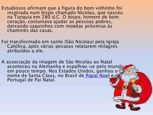 26. 26. Estudiosos afirmam que a figura do bom velhinho foi inspirada num bispo chamado Nicolau, que nasceu na Turquia em 280 d.C. O bispo, homem de bom coração, costumava ajudar as pessoas pobres, deixando saquinhos com moedas próximas às chaminés das casas.Foi transformado em santo (São Nicolau) pela Igreja Católica, após várias pessoas relatarem milagres atribuídos a ele.A associação da imagem de São Nicolau ao Natal aconteceu na Alemanha e espalhou-se pelo mundo em pouco tempo. Nos Estados Unidos, ganhou o nome de Santa Claus, no Brasil de Papai Noel e em Portugal de Pai Natal.