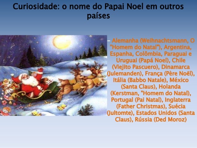 27. 27. Curiosidade: o nome do Papai Noel em outros países - Alemanha (Weihnachtsmann, O "Homem do Natal"), Argentina, Espanha, Colômbia, Paraguai e Uruguai (Papá Noel), Chile (Viejito Pascuero), Dinamarca (Julemanden), França (Père Noël), Itália (Babbo Natale), México (Santa Claus), Holanda (Kerstman, "Homem do Natal), Portugal (Pai Natal), Inglaterra (Father Christmas), Suécia (Jultomte), Estados Unidos (Santa Claus), Rússia (Ded Moroz)