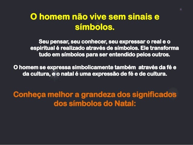 2. 2. O homem não vive sem sinais e símbolos. Seu pensar, seu conhecer, seu expressar o real e o espiritual é realizado através de símbolos. Ele transforma tudo em símbolos para ser entendido pelos outros.O homem se expressa simbolicamente também através da fé e da cultura, e o natal é uma expressão de fé e de cultura.Conheça melhor a grandeza dos significados dos símbolos do Natal: