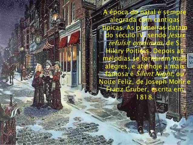 35. 35. A época do natal é sempre alegrada com cantigas típicas. As primeiras datam do século IV, sendo Jesus refulsit omninum, de S. Hilary Poitiers. Depois as melodias se tornaram mais alegres, e até hoje a mais famosa é Silent Night, ouNoite Feliz, de Joseph Mohr e Franz Gruber, escrita em 1818.