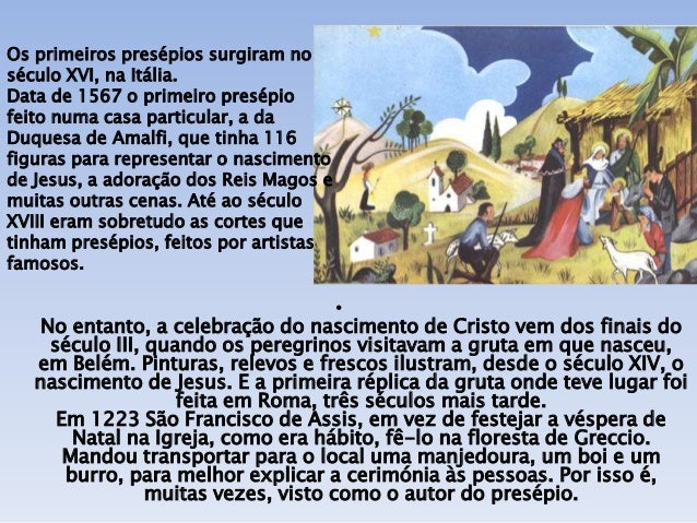 4. 4. Os primeiros presépios surgiram noséculo XVI, na Itália.Data de 1567 o primeiro presépiofeito numa casa particular, a daDuquesa de Amalfi, que tinha 116figuras para representar o nascimentode Jesus, a adoração dos Reis Magos emuitas outras cenas. Até ao séculoXVIII eram sobretudo as cortes quetinham presépios, feitos por artistasfamosos. • No entanto, a celebração do nascimento de Cristo vem dos finais do século III, quando os peregrinos visitavam a gruta em que nasceu, em Belém. Pinturas, relevos e frescos ilustram, desde o século XIV, o nascimento de Jesus. E a primeira réplica da gruta onde teve lugar foi feita em Roma, três séculos mais tarde. Em 1223 São Francisco de Assis, em vez de festejar a véspera de Natal na Igreja, como era hábito, fê-lo na floresta de Greccio. Mandou transportar para o local uma manjedoura, um boi e um burro, para melhor explicar a cerimónia às pessoas. Por isso é, muitas vezes, visto como o autor do presépio.