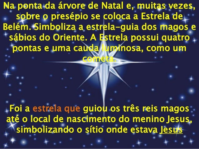 7. 7. Na ponta da árvore de Natal e, muitas vezes, sobre o presépio se coloca a Estrela deBelém. Simboliza a estrela-guia dos magos e sábios do Oriente. A Estrela possui quatro pontas e uma cauda luminosa, como um cometa. Foi a estrela que guiou os três reis magosaté o local de nascimento do menino Jesus, simbolizando o sítio onde estava Jesus