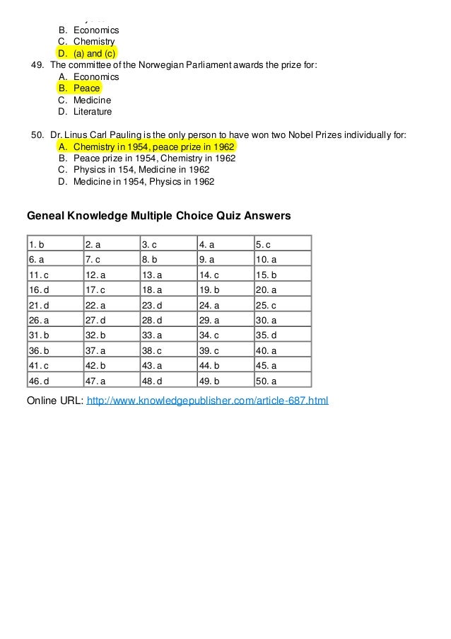 7. 7. A. Physics B. Economics C. Chemistry D. (a) and (c) 49. The committee of the Norwegian Parliament awards the prize for: A. Economics B. Peace C. Medicine D. Literature 50. Dr. Linus Carl Pauling is the only person to have won two Nobel Prizes individually for: A. Chemistry in 1954, peace prize in 1962 B. Peace prize in 1954, Chemistry in 1962 C. Physics in 154, Medicine in 1962 D. Medicine in 1954, Physics in 1962 Geneal Knowledge Multiple Choice Quiz Answers 1. b 2. a 3. c 4. a 5. c 6. a 7. c 8. b 9. a 10. a 11. c 12. a 13. a 14. c 15. b 16. d 17. c 18. a 19. b 20. a 21. d 22. a 23. d 24. a 25. c 26. a 27. d 28. d 29. a 30. a 31. b 32. b 33. a 34. c 35. d 36. b 37. a 38. c 39. c 40. a 41. c 42. b 43. a 44. b 45. a 46. d 47. a 48. d 49. b 50. a Online URL: http://www.knowledgepublisher.com/article-687.html