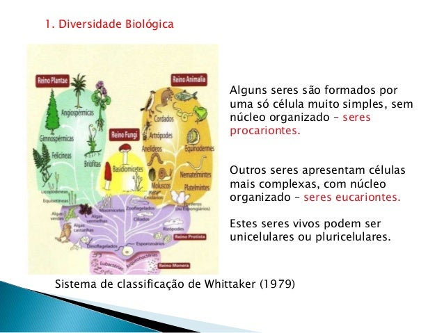 2. 2. 1. Diversidade Biológica Alguns seres são formados por uma só célula muito simples, sem núcleo organizado – seres procariontes. Outros seres apresentam células mais complexas, com núcleo organizado – seres eucariontes. Estes seres vivos podem ser unicelulares ou pluricelulares. Sistema de classificação de Whittaker (1979)