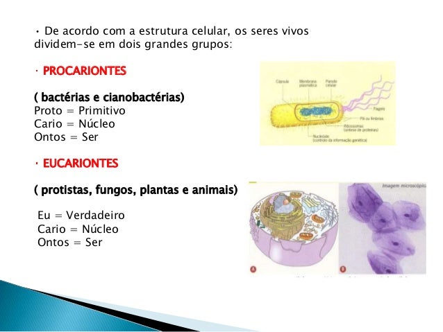 7. 7. • De acordo com a estrutura celular, os seres vivos dividem-se em dois grandes grupos: PROCARIONTES ( bactérias e cianobactérias) Proto = Primitivo Cario = Núcleo Ontos = Ser EUCARIONTES ( protistas, fungos, plantas e animais) Eu = Verdadeiro Cario = Núcleo Ontos = Ser