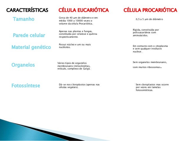 8. 8. CARACTERÍSTICAS CÉLULA EUCARIÓTICA CÉLULA PROCARIÓTICA Tamanho Cerca de 40 μm de diâmetro e em média 1000 a 10000 vezes o volume da célula Procariótica. 0,5 a 5 μm de diâmetro Parede celular Apenas nas plantas e fungos, constituída por celulose e quitina respectivamente. Rígida, constituída por polissacarídeos com aminoácidos. Material genético Possui núcleo e um ou mais nucléolos. Em contacto com o citoplasma e sem qualquer invólucro nuclear. Organelos Vários tipos de organelos membranares (mitocôndrias, retículo, complexo de Golgi). Sem organelos membranares, com muitos ribossomas. Fotossíntese Dá-se nos cloroplastos (apenas nas células vegetais). Sem cloroplastos mas ocorre por vezes em lamelas fotossintéticas.