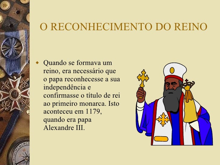 10. 10. O RECONHECIMENTO DO REINO <ul><li>Quando se formava um reino, era necessário que o papa reconhecesse a sua independência e confirmasse o título de rei ao primeiro monarca. Isto aconteceu em 1179, quando era papa Alexandre III. </li></ul>