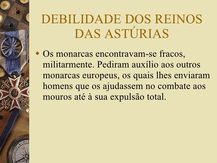 3. 3. DEBILIDADE DOS REINOS DAS ASTÚRIAS <ul><li>Os monarcas encontravam-se fracos, militarmente. Pediram auxílio aos outros monarcas europeus, os quais lhes enviaram homens que os ajudassem no combate aos mouros até à sua expulsão total. </li></ul>