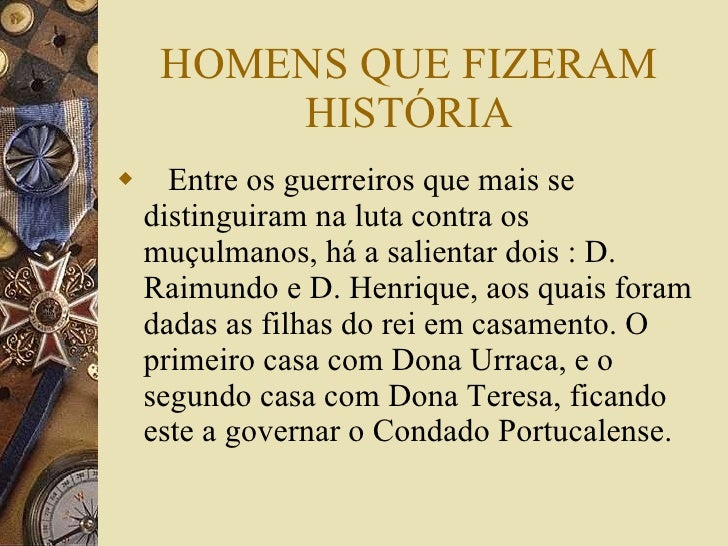 4. 4. HOMENS QUE FIZERAM HISTÓRIA <ul><li>Entre os guerreiros que mais se distinguiram na luta contra os muçulmanos, há a salientar dois : D. Raimundo e D. Henrique, aos quais foram dadas as filhas do rei em casamento. O primeiro casa com Dona Urraca, e o segundo casa com Dona Teresa, ficando este a governar o Condado Portucalense. </li></ul>