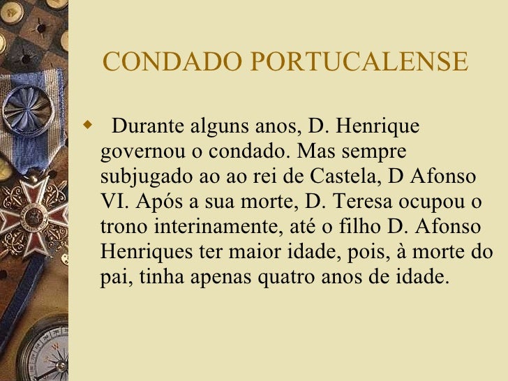 5. 5. CONDADO PORTUCALENSE <ul><li>Durante alguns anos, D. Henrique governou o condado. Mas sempre subjugado ao ao rei de Castela, D Afonso VI. Após a sua morte, D. Teresa ocupou o trono interinamente, até o filho D. Afonso Henriques ter maior idade, pois, à morte do pai, tinha apenas quatro anos de idade. </li></ul>