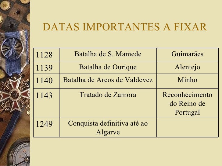 8. 8. DATAS IMPORTANTES A FIXAR Conquista definitiva até ao Algarve 1249 Reconhecimento do Reino de Portugal Tratado de Zamora 1143 Minho Batalha de Arcos de Valdevez 1140 Alentejo Batalha de Ourique 1139 Guimarães Batalha de S. Mamede 1128