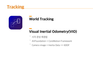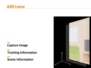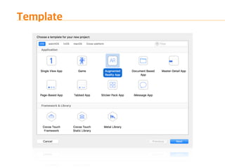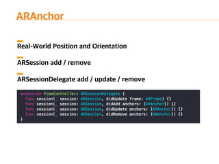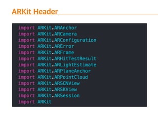The document introduces ARKit, Apple's augmented reality platform. It discusses ARKit's capabilities for tracking scenes, understanding planes and lighting, and rendering augmented content. The document also provides an overview of an ARKit demo and ARKit playgrounds. It concludes with a summary of ARKit's strengths like no extra hardware requirements and integration with game engines, as well as limitations like tracking only working horizontally and potential overheating issues.