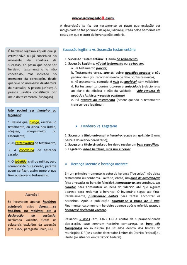 2. 2. A deserdação se faz por testamento ao passo que exclusão por indignidade se faz por meio de ação judicial ajuizada pelos herdeiros em casos em que o autor da herança não poderia. É herdeiro legítimo aquele que já • estiver vivo ou já concebido no momento da abertura da sucessão, ao passo que pode ser herdeiro testamentário o não concebido, mas indicado no momento da concepção, desde que vivo no momento da abertura da sucessão; A pessoa jurídica; A pessoa jurídica constituída por meio do testamento (fundação). Sucessão legítima vs. Sucessão testamentária 1. Sucessão Testamentária: Quando há testamento; 2. Sucessão Legítima: não há testamento ou, se houver: a. Há testamento parcial; b. Testamento versa, apenas, sobre questões pessoas e não patrimoniais (ex. reconhecimento de filho por testamento); c. Há testamento, contudo, é nulo ou anulável (sem validade); d. Há testamento, porém, ocorreu a caducidade (relaciona-se ao plano da eficácia e não da validade – vide resumo de negócios jurídicos – escada pontiana) e. Há ruptura do testamento (ocorre quando o testamento transcende a legítima); Não poderá ser herdeiro ou legatário: 1. Pessoa que, a rogo, escreveu o testamento, ou ainda, seu irmão, cônjuge, companheiro ou ascendente; 2. As testemunhas do testamento; 3. A concubina do testador casado; 4. O tabelião, civil ou militar, ou o comandante ou escrivão, perante quem se fizer, assim como o que fizer ou provar o testamento; Atenção! Se houverem apenas herdeiros colaterais estes devem se habilitar, no máximo, até a declaração de vacância. Declarada vacante, ficam os colaterais excluídos da sucessão (art. 1.822, parágrafo único, CC). • Herdeiro Vs. Legatário 1. Sucessor a título universal: o herdeiro recebe um quinhão (é uma parcela do acervo hereditário); 2. Sucessor a título singular: o herdeiro recebe um bem específico; 3. Legatário: não é herdeiro, mas sim sucessor. • Herança Jacente e herança vacante Em um primeiro momento, o autor da herança (“de cujos”) não deixa testamento ou herdeiros. Lavra-se, então, um auto de arrecadação (visa arrecadar os bens do falecido), nomeando-se, ato contínuo, um curador para administrar os bens do falecido até que alguém aparece para reclamar a herança. O inventário segue até final. Paralelamente, publicam-se editais para tentar encontrar os herdeiros. Após a publicação aguarda-se o prazo de 1 ano. Finalmente, caso nenhum herdeiro aparece após o referido prazo, a herança é declarada vacante. Passados 5 anos (art. 1.822 CC) a contar da supramencionada declaração, caso nenhum herdeiro compareça, os bens são transferidos ao município (se situados dentro dos limites do município), DF (se situados dentro dos limites do Distrito Federal) ou União (se situados em território federal).