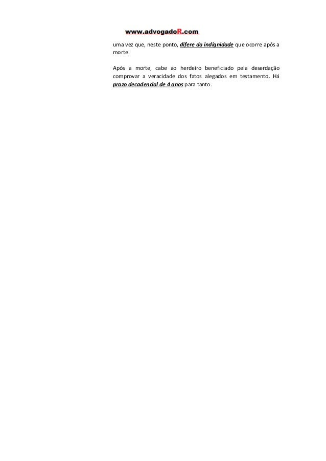 5. 5. uma vez que, neste ponto, difere da indignidade que ocorre após a morte. Após a morte, cabe ao herdeiro beneficiado pela deserdação comprovar a veracidade dos fatos alegados em testamento. Há prazo decadencial de 4 anos para tanto.