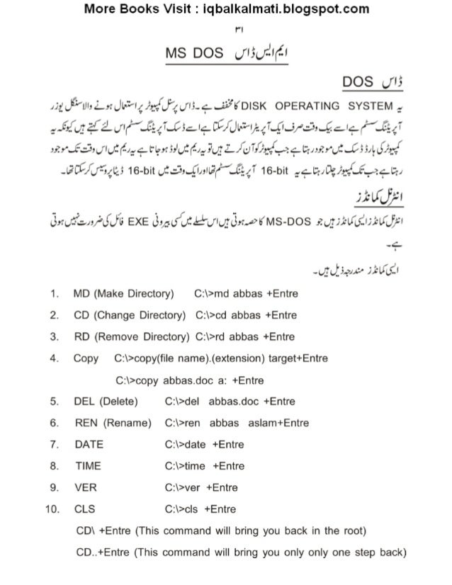 32. 32. More Books Visit : iqbalkalmati. blogspot. com Fl MS DOS t/ Imam DOS JI5 / jgJ§’IJI: L.~¢Jla=7’|4}; -5/J>4J|5-9.£37KD| SK OPERATING SYSTEM, 2-fifuz->. —’iwr" ~5€4"~*75¢'+C‘/ Jk”%47~—9-5/=5’~§c'+r” 5514" : ;Z: ’.f_‘~L'! ;(jIL; .f(-: ;_. _.: ._t‘lgx5:’; ,J5fi1,? q_fL/ /gT.0;_~. {/. ,.z9l: '¢u. »?r‘(}. 'I_. C551l, d// :_g{ -I2I“J5/. ;=', /,I: _3 16-bit O: _~: s,. _(I/ ,II2(“’. €§4I' 16-bit , _¢l2/0;/3;: ,’: .F__2.‘¢t‘y J1°LU}’I .3n. ;:~’. ~.; ,/JJ’Is EXE (3;/ .-u{z1&1_; I.; _rI3,¢. a>KMs-Dos , z.; ;;; ~IQ, <I;2u’J}'I -9 -. /g. _)_5.. »,c» J}. -Ifuit 1. MD (Make Directory) C: >md abbas +Entre CD (Change Directory) C: >cd abbas +Entre RD (Remove Directory) C: >rd abbas +Entre . "‘. °°. '° Copy C: >copy(fi| e name). (extension) target+Entre C: >copy abbas. doc a: +Entre DEL (Delete) C: >deI abbas. doc +Entre REN (Rename) C: >ren abbas as| am+Entre DATE C: >date +Entre TIME C: >time +Entre $°. °°. “.°°. ‘-" VER C: >ver +Entre 10. CLS C: >c| s +Entre CD +Entre (This command will bring you back in the root) CD. .+Entre (This command will bring you only only one step back)