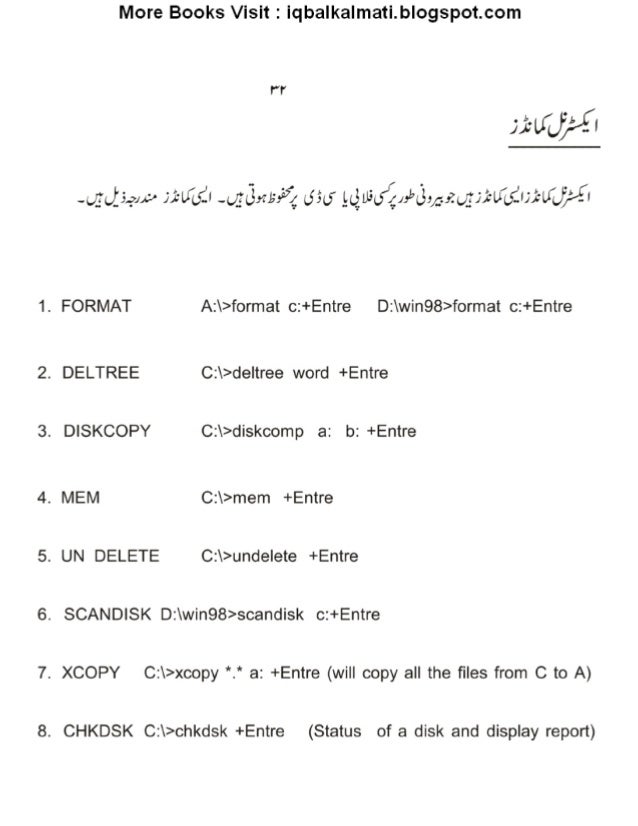 33. 33. 8. More Books Visit : iqbalkalmati. blogspot. com l"’l’ -g§(f_341pJfiLf(f. l-u§(3M£? ’; (555 _l, LélJ5Q’; ?/: ”(.5:/ _1.: ?(J. 'fJ, 't°U/ (;{. l}, i’U/ (/‘}’. !/l . FORMAT A: >format c: +Entre D: win98>fOrmat c: +Entre DELTREE C: >de| tree word +Entre . DISKCOPY C: >diskcomp as b: +Entre MEM C: >mem +Entre . UN DELETE C: >undelete +Entre . SCANDISK D: win98>scandisk c: +Entre . XCOPY C: >xcopy *. * a: +Entre (will copy all the files from C to A) CHKDSK C: >chkdsk +Entre (Status of a disk and display report)