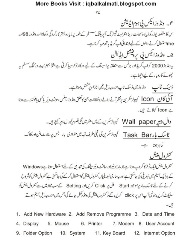 38. 38. More Books Visit : iqbalkalmati. blogspot. com V4 flélfifidgffljafi: J" A198»; -MI11335/ikfeepgvii/ ”.€g47.ff? -a/ f'la: .:J{uI; ;C; gM3»Kw -; _I°/ _I, .» “Lg/ .,IJIA2I, &£OiI; £_/ Jtfirvme QM-611$: -0 , ('“.6’/ , 11,22‘- 3/_l_, ;»'? :71$: é£. €.: ’l4 . 'aL: >c. t/7/. »uj/ ;I/2000;»-I, -L¢lp_: l_; £:J£I5J{2‘—1a-3°’ -§. t')’im¢l7.’(_')'E(J_5,_>/ ,&3’~. _:«l7e. aC5(_}-’: J.);73 %, l£’. _.Q5 l7‘: ’s'¢.1fl: .’_l, o"T, [:: .5’r«(f7rJ:17:J1;{(; fi.°: «l? L5a: L.| :L. V:%q; }.g_~r, { | C0n _; _;__t L111’/ Icon 9 -tJ, ?é: "—Kz, -7§‘tJ"’C/ "'; J.LiL/ ~‘~'): ;'tJ7’= £L'J: );/ J'€. “:{ Wall papergregjla J»<»Im: u4.fi :1 d: v:». x.. >.2/wiw/ ;:. «.’ Task BanI. ..CI* -‘L l7)’: /:ll; b0 3 Windows‘; t‘nJla~'~'*| i£I, §'_ »‘: :'t¢(-v6/: ".‘/ .?’! —‘r3lr15'/ .7/95;| ‘., :?‘¢ t'x. ?.; /P K/ ":7.. «_U(f= ’-‘J: /‘Jr Cs/ ‘/J'= ‘*J: /9J‘IeJ£/ JWI/ JPJ: /ueidxI«, »'et3‘IeJI: E4FIfiF7~§z£ IL)’-"= J,, *-‘J; g:x°: y«£ Setting»U_/ Click Start : :?r‘4/g. Ct‘i: CL/ z_; :(‘: I'Of5., w.~»u: .,fl. ,7Let}‘§1~, I,5'. J‘~'nJ, /*5’ Jig/ ’ click 4;/ I.? .I'I.5.’z. ;_/ .u_CI» -as 1. Add New Hardware 2. Add Remove Programme 3. Date and Time 4. Display 5. Mouse 6. Printer 7. Modem 8. User Account 9. Folder Option 10. System 11. Key Board 12. Internet Option