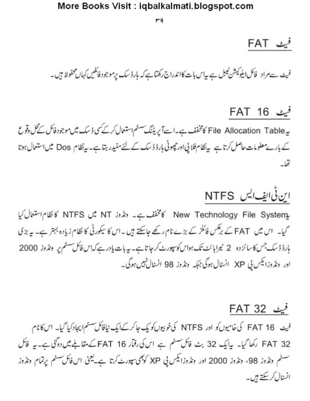 40. 40. More Books Visit : iqbalkalmati. blogspot. com V4 FAT -(J. ‘§£:5‘; (Jl¢J/ (f_, ‘L/ G:: ?r4.65/§f€'_l°l9:Zgl; ,ClK. >§Jl: «9(A': ;;'££| (J'15 J‘/ éév-,5‘ FAT 16 aim’; JIsAzr. ;:. C5(f£/ ()1-= ~I(". €g4T. ;I-a_. a2?K File Allocation Table, mJI»= ~I. ;: Dos (lb'f. __. -‘¢lla-1,I_;3*iA: ..C55/§I3:€’, ’1:lQlL5"l£3,_, ‘gt’/ Ulla. -.l. :1": _;LA: no J45 NTFS d~I_. yIt§t. gI t, }Ul. ~'~°*I'/ ll2‘Jl{ NTFS (J1 NT A13 -2‘-_. J33K New Technology File System, £5‘/ ..: -4". /:1/'o)_l_. J"l£5K3/)éK(fl_Q_? £lf£J(l7d—Z£}/ l5(f| i£ FAT an/ I -I_f 2000 A; -, 4("’J’Is. ;If9AIeg, -+LI? /.eA; ~/wncéexlm‘ 2 A-/ ’I/ k._fi. C5;, g -. fAOzUuJI 98 J21’: -, é.(f)’I'(_JU'J. l XP (gJ§IAJ. -I AI FAT 32 (cm -I[I, GI. ;_I/ ”.)IsI; .§I£/ Ig. §£A; .}J NTFS AI / (A: I;J FAT 16 J1; , -9J: :J4w£FAT 161:5/O/ Jl 9 (‘fife .2. 32 .9, -fi: I§ FAT 32 A2, (174 ("J’Is. ;I ate r/ BA; -J7 XP gg. ’ I/ '91’: AI 2000 A2, :98 A2, K’ _g_; '&E/ .JI: JI