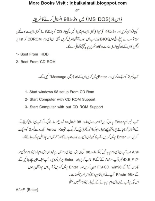 54. 54. More Books Visit : iqbalkalmati. blogspot. com O? ’ .2,/ =i, ’2_/ Ji: JI 981,1’, O: (MS DOS)5l. I/I5 . ;.«“°. A.: _t5si, r/’I)- rag, ’ CD ; ,_-. {., :’I5.; :,»I, I55t; ,Q5;. rt, ( 982,2, , ,I. ;/gI', O*, ,-I 4 lst / CDROM rI, i55I, r (3% .4/. )f, ;.-flT. _-A, u: ,I. ».; -BlOs; ,It§t4;. _/? r,r -€r_, JLa5Z? ;4egf, ,I€, r;. ,l: t5,); e"»2£IJI(J5’: 1- Boot From HDD 2- Boot From CD ROM -Z(/ _'/ I'Message af-/ -.5,I>! :C. (/Iu_'/ If-4Enter , ,Ig_'/ .:. Q-f 2 /12.91’ 1- Start windows 98 setup From CD Rom 2- Start Computer with CD ROM Support 3- Start Computer with out CD ROM Support / r.. _é: g:lx5(f. ;.T/ ;l-d¢L@MC5/‘L'! ZJlP. l 98 J: ,i75(j7c. /Jligj: //J4 Enter41/1‘; .11’ 3.9-/2/; ,,J Arrow Key? ‘at; /éd/ '§/ flfid/ :fl,5d¥__L3'1’u_§”4.l: at/ Jltzilcf. _? .Llg. .,C4flJ1{(/ I(; .i'fE, Ib’2_lg, t.: .,1c; I55J/ Ad/ K? I’. ._; ,/{#4 Enter AI .5)’ , :o‘-’, zrtK, fI,5,’I, i55i; I,'. fi¢D: ,»I, i55o' dsozl’ 981,1-, .f, £’ tjf/ lg4,'l, t55(; ’.? .T. _.l A: > £. ;_"I_, A;.4F. ,yI. ,T . ;_, /.; .’4 Enter , ,I. g/, ._-‘t FZZC A: > . ,T, ,é, D,E, F L15" uxgfi-jg JI. ,:.7?(, {:/ fix? Enter , ,lq/ _._/ L‘ F: >CD win98:A:7£JI/ -.5 -2_t, -Q, /uI, Qf,4rt? t;I2'_. ?.I' F: win 98>Z Ii7*. O:’”(tII’, fI,5_&£Ll5,4 , »I, I55o'L. ,T4-_CJI A: >F (Enter)