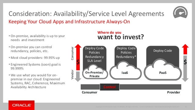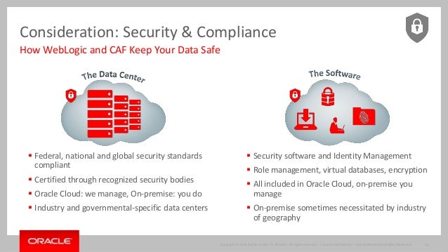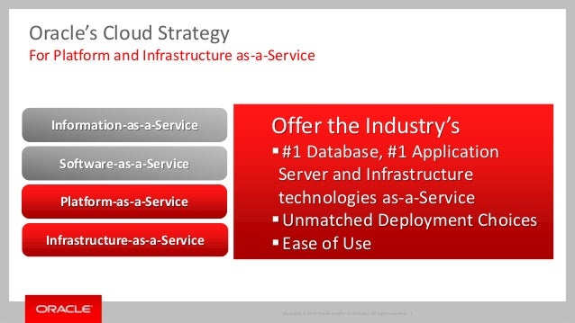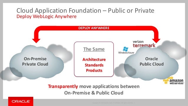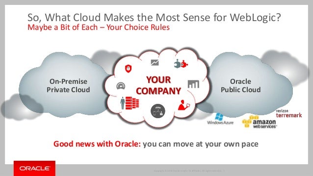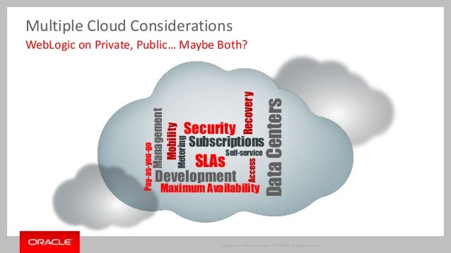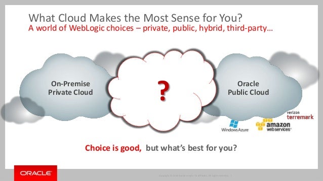 With Oracle WebLogic Server now available "as a service" both on premise working in conjunction with Oracle Enterprise Manager Cloud Pack and also in several Public Clouds beyond Oracle Public Cloud, customers have a clear set of architectural alternatives when looking at building out an enterprise cloud strategy for WebLogic Server. Cloud with WebLogic Server is not just core server but the layered and related products needed in a cloud infrastructure -Web Tier, WebLogic Server, Database and Fusion Middleware - as well as the full lifecycle capabilities needed: development, administration and operations. Navigate a pragmatic cloud approach for your organization and WebLogic Server.