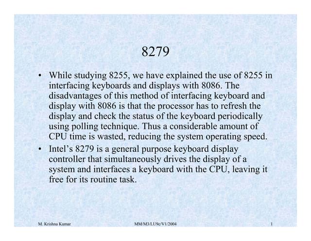 91. 91. 91 Machine ccoonnttrrooll iinnssttrruuccttiioonnss ccoonnttdd LOCK instruction this is a prefix to an instruction. This prefix makes sure that during execution of the instruction, control of system bus is not taken by other microprocessor. in multiprocessor systems, individual microprocessors are connected together by a system bus. This is to share the common resources. Each processor will take control of this bus only when it needs to use common resource. the lock prefix will ensure that in the middle of an instruction, system bus is not taken by other processors. This is achieved by hardware signal ‘LOCK’ available on one of the CPU pin. This signal will be made active during this instruction and it is used by the bus control logic to prevent others from taking the bus. once this instruction is completed, lock signal becomes inactive and microprocessors can take the system bus. WAIT instruction this instruction takes 8086 to an idle condition. The CPU will not do any processing during this. It will continue to be in idle state until TEST pin of 8086 becomes low or an interrupt signal is received on INTR or NMI. On valid interrupt, ISR is executed and processor enters the idle state again.