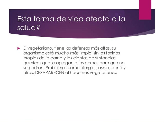 8. 8. Esta forma de vida afecta a la salud?  El vegetariano, tiene las defensas más altas, su organismo está mucho más limpio, sin las toxinas propias de la carne y las cientos de sustancias químicas que le agregan a las carnes para que no se pudran. Problemas como alergias, asma, acné y otros, DESAPARECEN al hacernos vegetarianos.