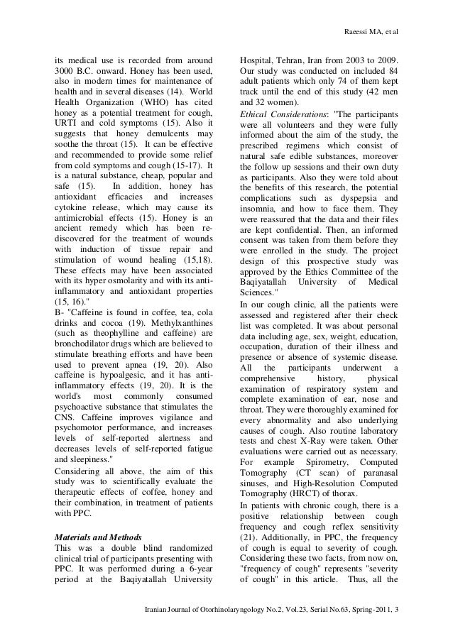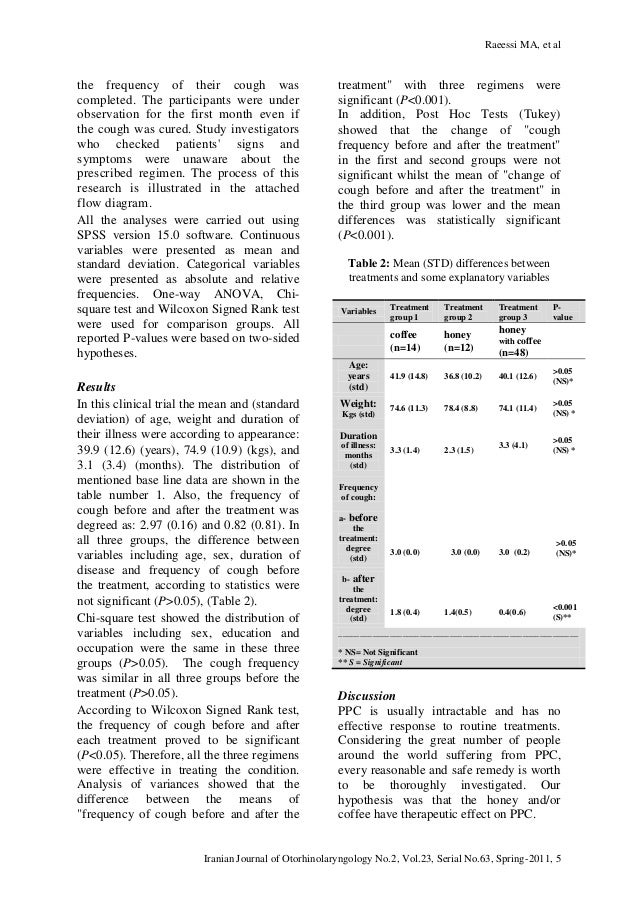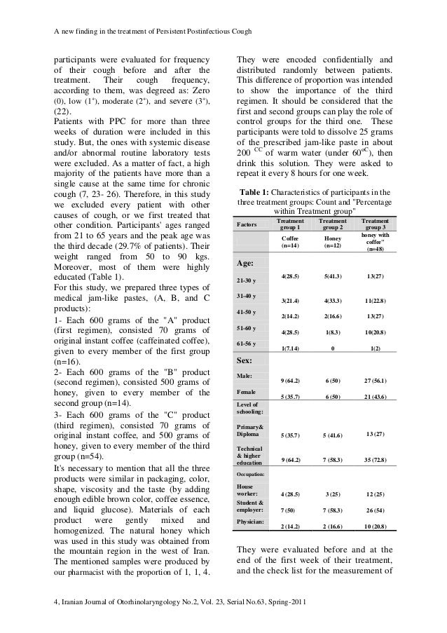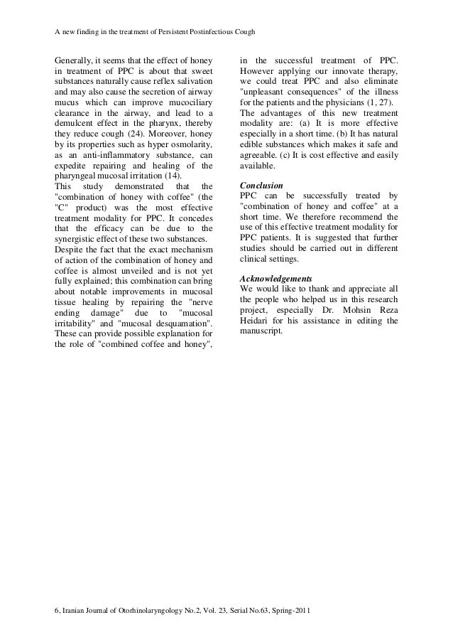 Comparing the effectiveness of all three treatment regimens, this study found "honey with coffee" as the most effective treatment modality for PPC (P<0.001). Combination of honey and coffee can successfully treat the PPC at a short time. Thus, it is recommended for the treatment of PPC.