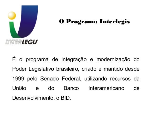 2. 2. O Programa Interlegis É o programa de integração e modernização do Poder Legislativo brasileiro, criado e mantido desde 1999 pelo Senado Federal, utilizando recursos da União e do Banco Interamericano de Desenvolvimento, o BID.