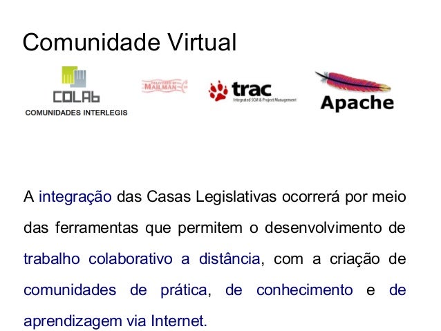 3. 3. Comunidade Virtual A integração das Casas Legislativas ocorrerá por meio das ferramentas que permitem o desenvolvimento de trabalho colaborativo a distância, com a criação de comunidades de prática, de conhecimento e de aprendizagem via Internet.