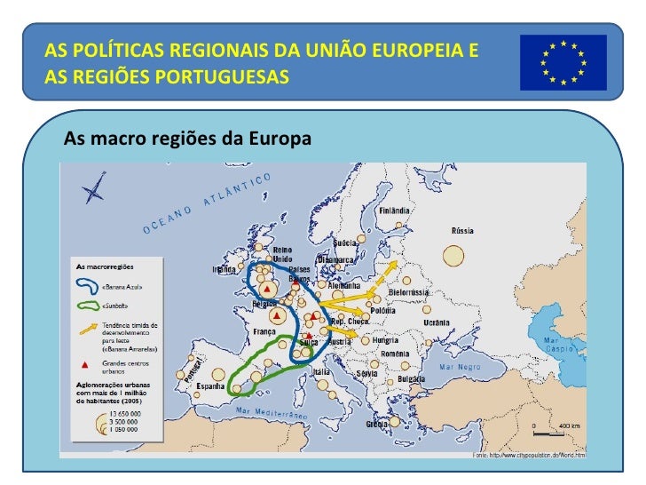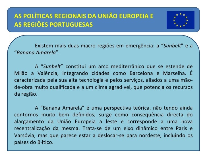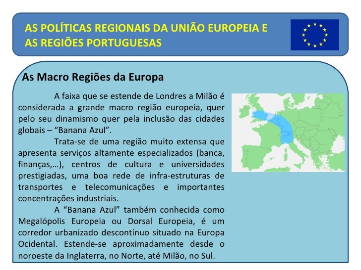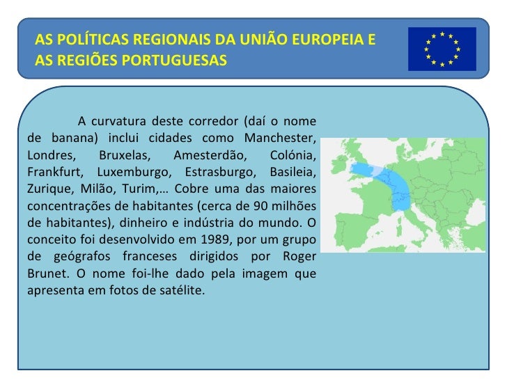 8. 8. A curvatura deste corredor (daí o nome de banana) inclui cidades como Manchester, Londres, Bruxelas, Amesterdão, Colónia, Frankfurt, Luxemburgo, Estrasburgo, Basileia, Zurique, Milão, Turim,… Cobre uma das maiores concentrações de habitantes (cerca de 90 milhões de habitantes), dinheiro e indústria do mundo. O conceito foi desenvolvido em 1989, por um grupo de geógrafos franceses dirigidos por Roger Brunet. O nome foi-lhe dado pela imagem que apresenta em fotos de satélite. AS POLÍTICAS REGIONAIS DA UNIÃO EUROPEIA E AS REGIÕES PORTUGUESAS