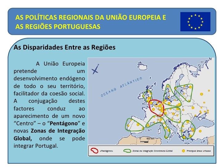 11. 11. As Disparidades Entre as Regiões A União Europeia pretende um desenvolvimento endógeno de todo o seu território, facilitador da coesão social. A conjugação destes factores conduz ao aparecimento de um novo “Centro” – o “ Pentágono ” e novas Zonas de Integração Global, onde se pode integrar Portugal. AS POLÍTICAS REGIONAIS DA UNIÃO EUROPEIA E AS REGIÕES PORTUGUESAS